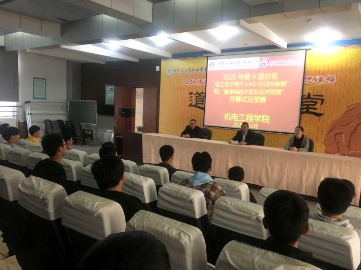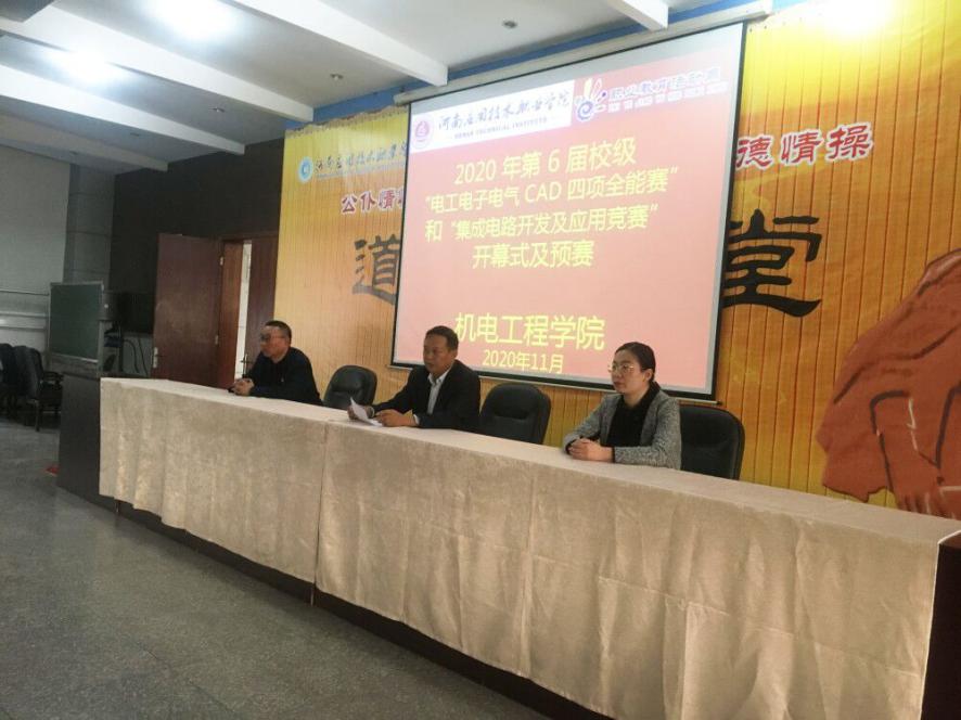 为大力弘扬劳动光荣、技能宝贵、创造伟大的时代风尚,进一步营造全社会关心支持职业教育的良好氛围,以“人人出彩,技能强国”为主题的2020年职业教育周活动于11月8日正式开始,机电工程学院积极参与,11月9日下午举办了2020年第六届校级“电工电子电气CAD四项全能赛”和“集成电路开发及应用竞赛”的开幕式,机电工程学院院长黄双成、副院长李凤银及教务办公室主任孙彩云参与开幕式,并指出此活动目的在于弘扬劳动光荣、技能宝贵、创造伟大的时代风尚,形成“崇尚一技之长、不唯学历凭能力”的良好学习氛围。