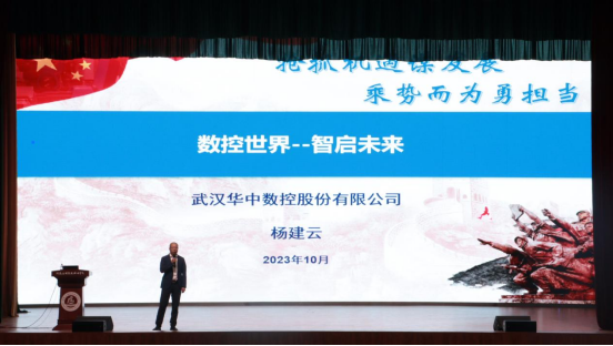 为进一步推动具有职业教育特色的校园文化建设,加强人才培养质量,拓宽校企合作渠道,打造实习就业平台,2023年10月18日晚,机电工程学院于学生活动中心开展“数控世界 智启未来”企业文化进校园专题宣讲会,本次会议邀请到武汉华中数控股份有限公司中北片区总监杨建云作为主讲,学院院长黄双成、团总支书记郭娇娇以及全体23级学生参加了本次活动。