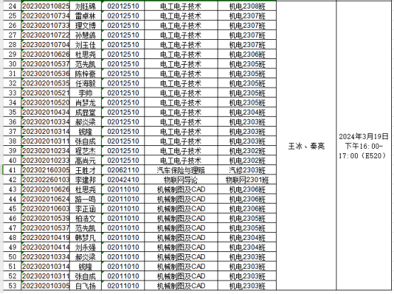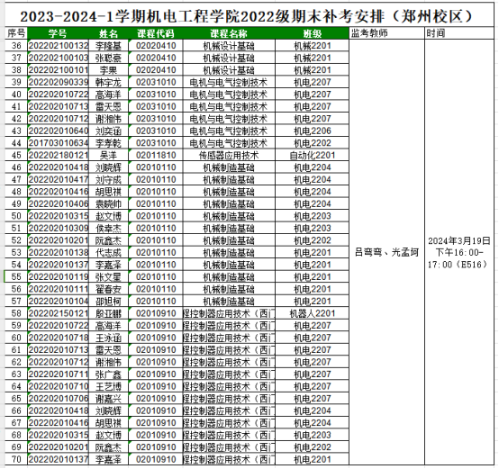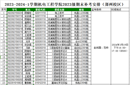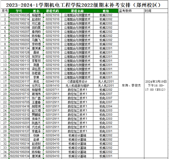 补考课程补考时间为2024年3月19日周二下午,机电工程学院根据实际情况,做具体安排详见下表。