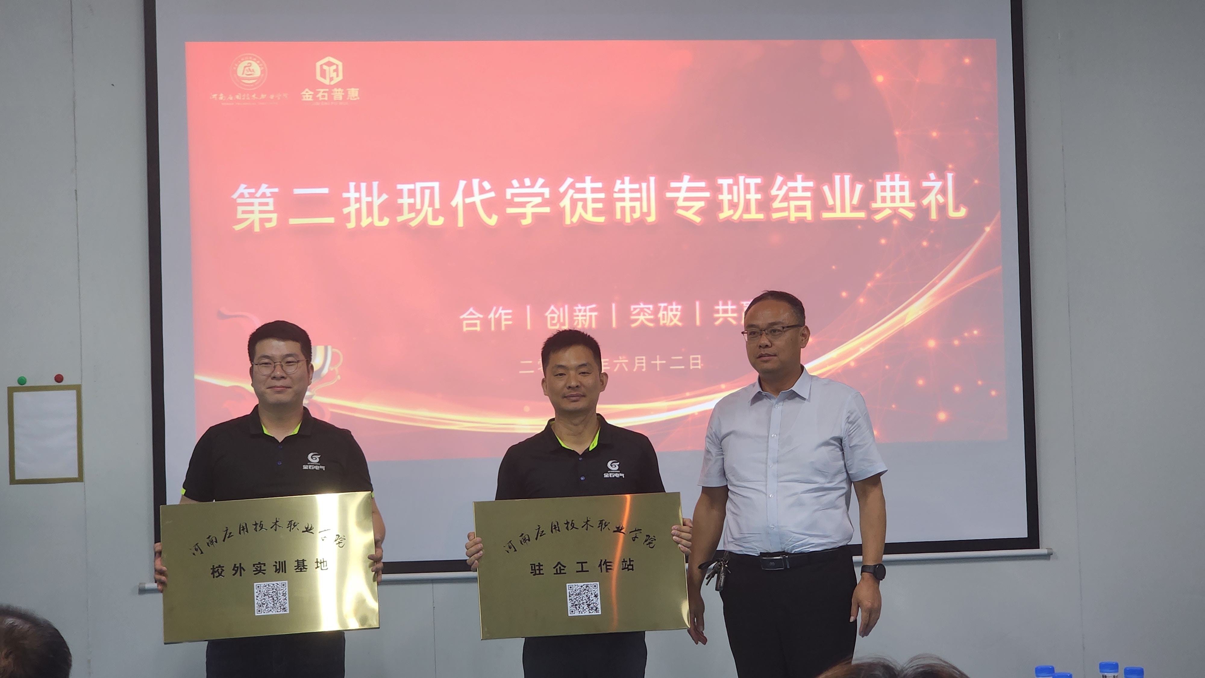 夏树苍翠,晨光熹微。河南应用技术职业学院机电工程学院与河南金石普惠科技有限公司联合举办的第二批现代学徒制专班结业典礼,于2024年6月13日在河南金石普惠科技有限公司顺利举行。河南应用技术职业学院副校长黄振中、河南金石普惠科技有限公司总经理王晨辉等领导参加了上述活动。