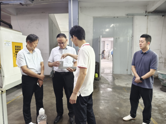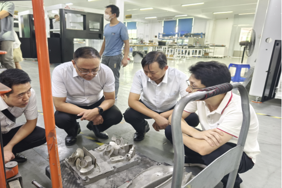 在东莞市磐锐科技有限公司董事长樊伟超的陪同下,黄振中一行首先重点参观了公司的生产车间与成果展览馆。参观过程中,黄振中校长对金属 3D 打印技术表现出了浓厚的兴趣,与车间技术人员进行了深入的探讨,对车间内的 3D 打印机设备以及打印出的金属零件进行了细致入微的了解。