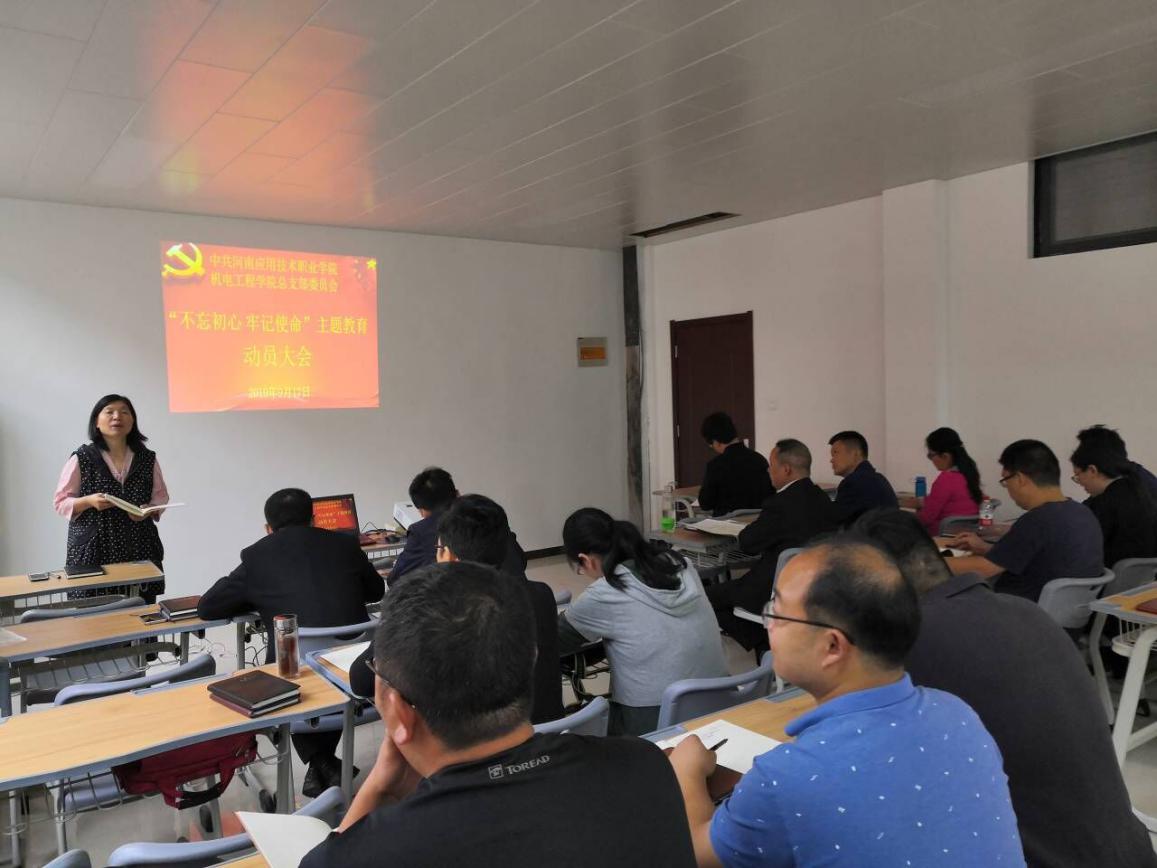 2019年9月17日下午2点,机电工程学院党总支在A212召开“不忘初心、牢记使命”主题教育全体党员动员大会,标志着机电工程学院党总支“不忘初心、牢记使命”主题教育正式开启。