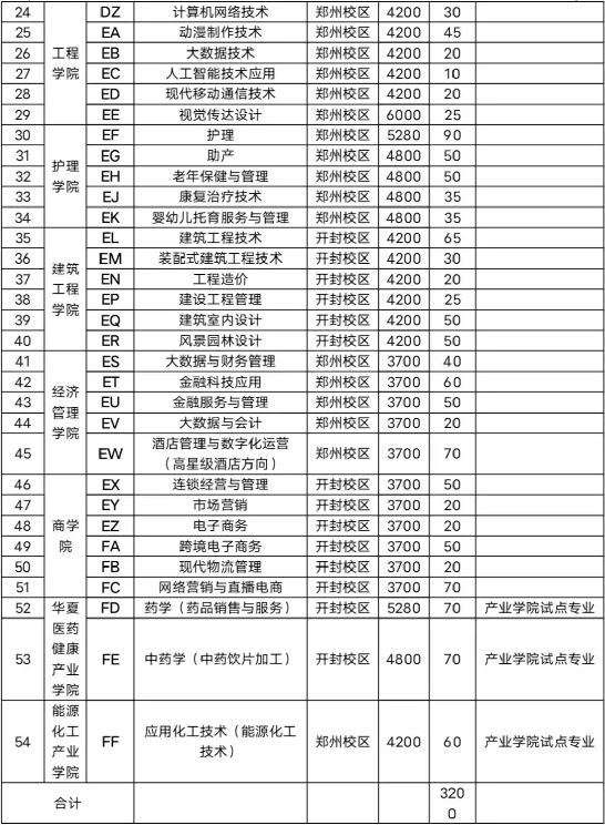 郑州校区:应用化工技术、精细化工技术、分析检验技术、化妆品经营与管理、食品检验检测技术、机械设计与制造、机电一体化技术、工业过程自动化技术、工业机器人技术、无人机应用技术、物联网应用技术、计算机应用技术、计算机网络技术、动漫制作技术、大数据技术、人工智能技术应用、现代移动通信技术、视觉传达设计、护理、助产、老年保健与管理、康复治疗技术、婴幼儿托育服务与管理、大数据与财务管理、金融科技应用、金融服务与管理、大数据与会计、酒店管理与数字化运营(高星级酒店方向)、应用化工技术(能源化工技术方向)。