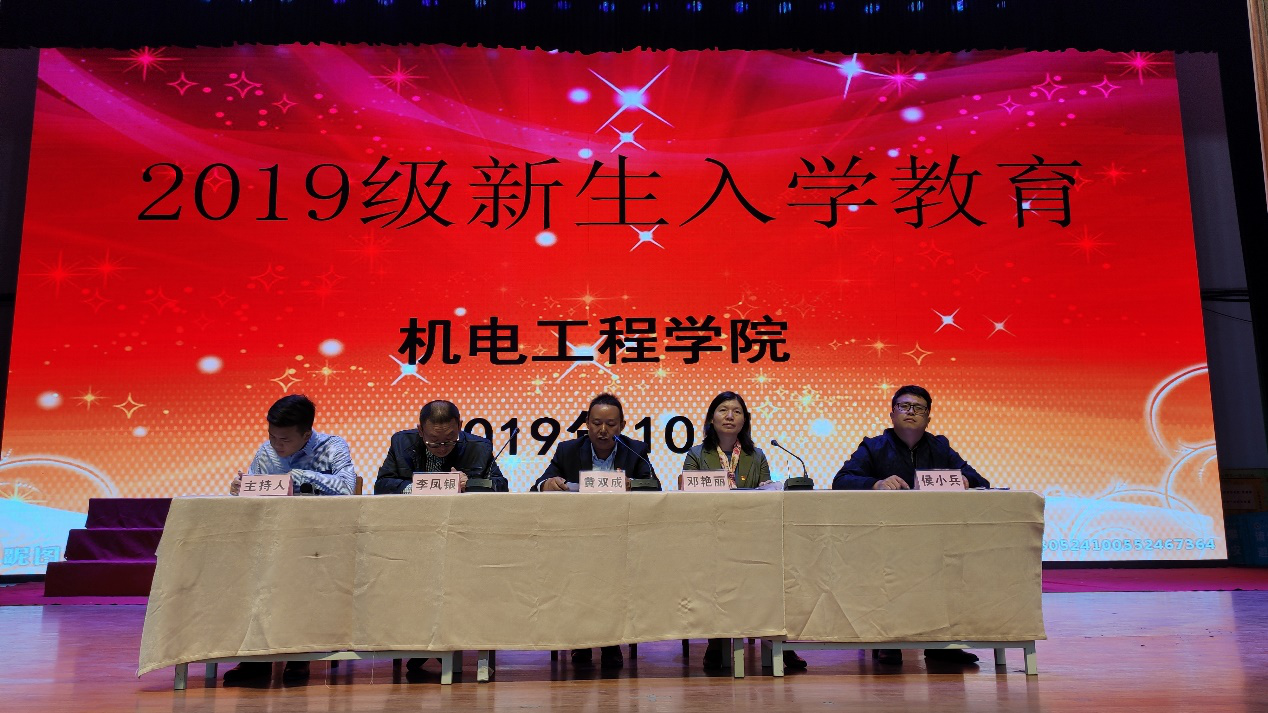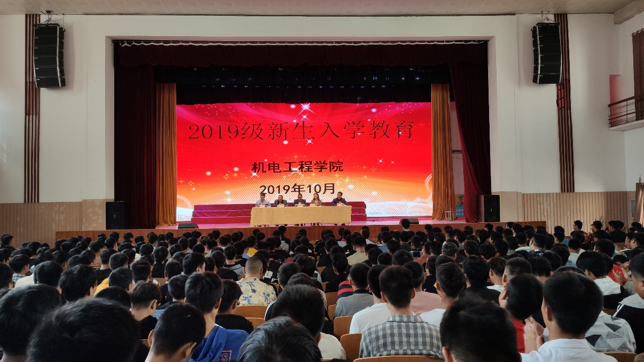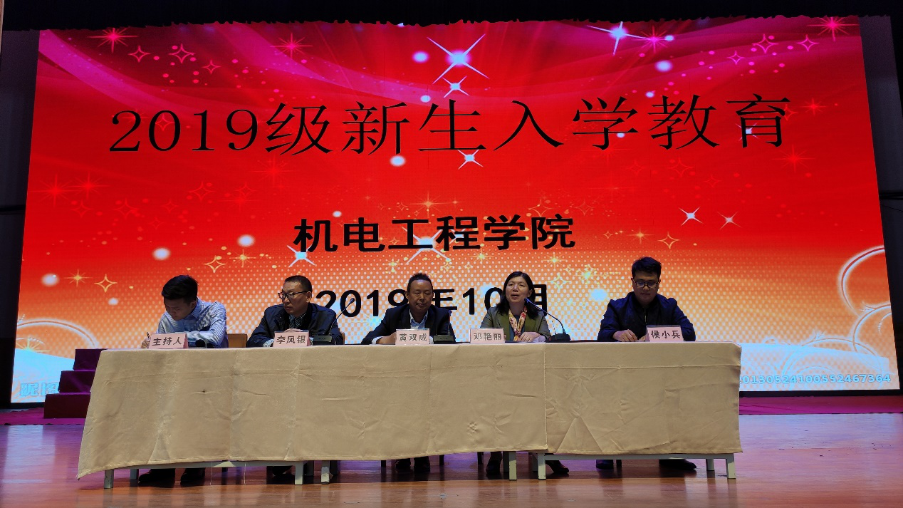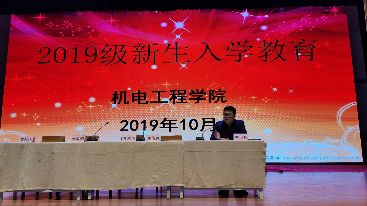 2019年10月8日上午10点,机电工程学院在大礼堂举行2019级新生入学教育。出席本次会议的有:学院院长黄双成、学院党总支副书记邓艳丽、学院副院长李凤银、学院学工部主任侯小兵及2019级新生及辅导员。会议由学院团总支书记常惟诚主持。