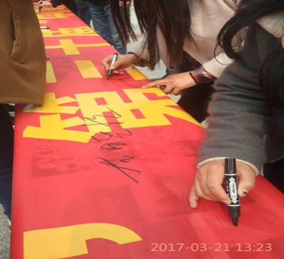为宣传我国水资源现状及节约用水知识,培养学生热爱水、珍惜水、节约水、保护水的意识,倡导节约观念,建设文明学校,围绕增强节水习惯,树立节水为荣、浪费可耻的正气。根据学院后勤处《2017年“世界水日”、“中国水周”活动方案》的文件要求,2017年3月21日下午1:00机电工程学院50名学生代表在学院北广场参加了主题签名活动。