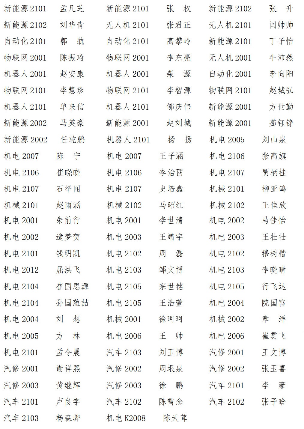 按照《河南应用技术职业学院关于做好2022年国家奖助学金评审工作的通知》的要求,机电工程学院在学生本人申请、学生谈话的基础上,经过班级评定、学院审核,圆满完成2022年国家奖学金、国家励志奖学金、国家助学金评定工作,现将名单予以公示,接受全院师生监督。公示名单如下: