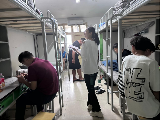 宿舍内务整理完毕后,机电工程学院学工办主任郭娇娇与23级辅导员齐聚4号宿舍楼,开展了一次全面细致的内务检查活动。此次内务检查主要针对宿舍环境、床铺整理、物品摆放等方面,旨在培养新生良好的宿舍卫生和秩序意识。